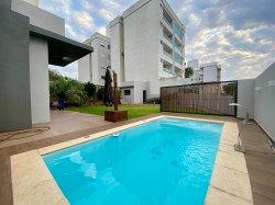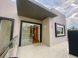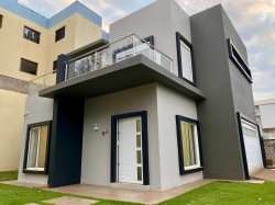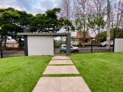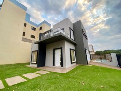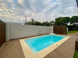 Garagem para 02 carros, com churrasqueira, piscina aquecida com leds e ombrelone.