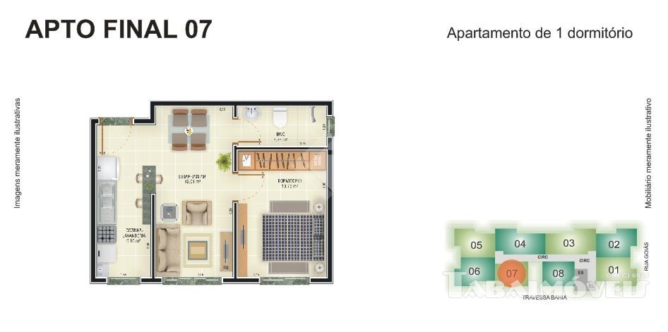Apartamento com 01 dormitório, sala, cozinha, banheiro, área de serviço e 01 vaga de garagem.