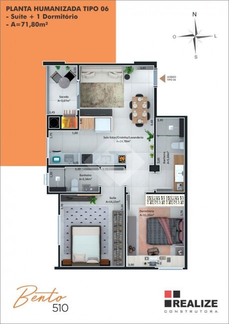 Apto com 1 suíte + 1 dormitórios, com 71,80m² de área privativa
