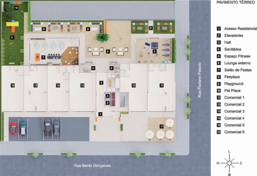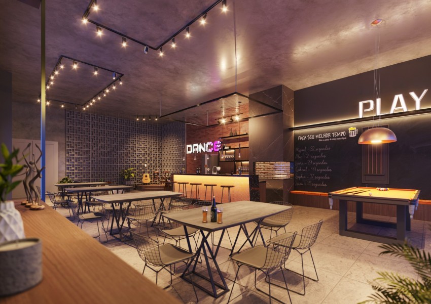 Hall de entrada Social, com pé-direito elevado, salões de festas com sala de jogos, espaço Kids, play ground, academia, Pet Place, e vários ambientes distribuídos nos terraços abertos, (tudo mobiliado);