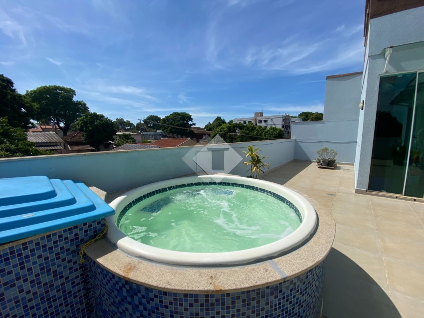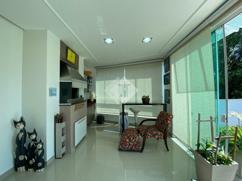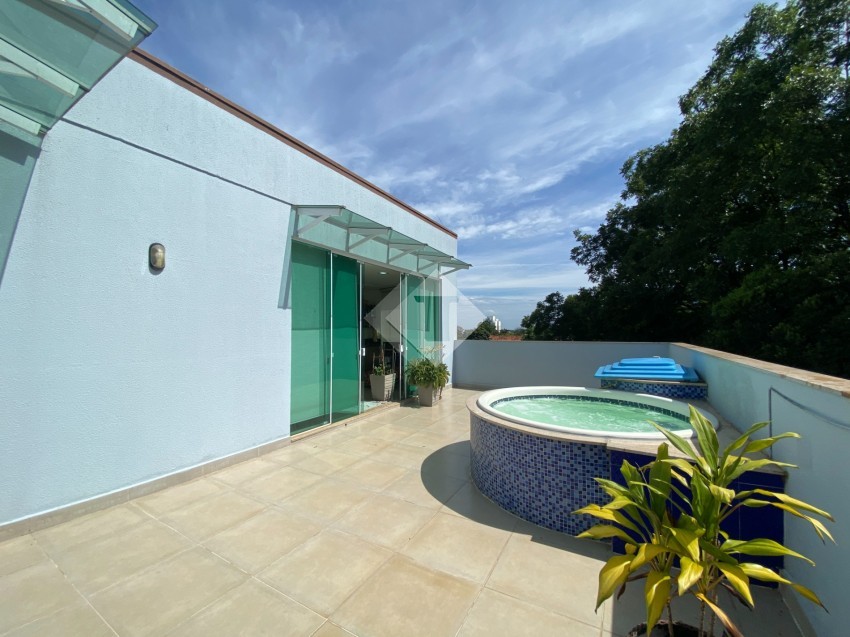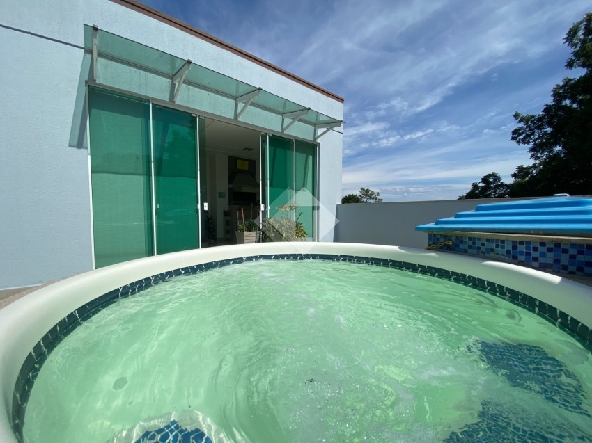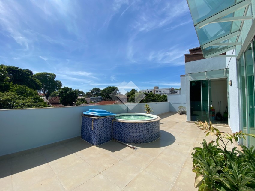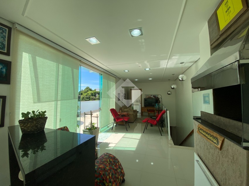 No piso superior, há uma área gourmet com fogão a gás, e churrasqueira a carvão, lavanderia e um lavabo.