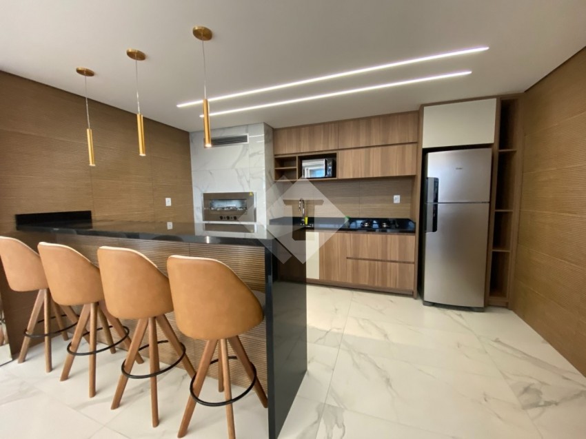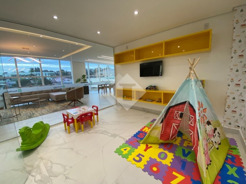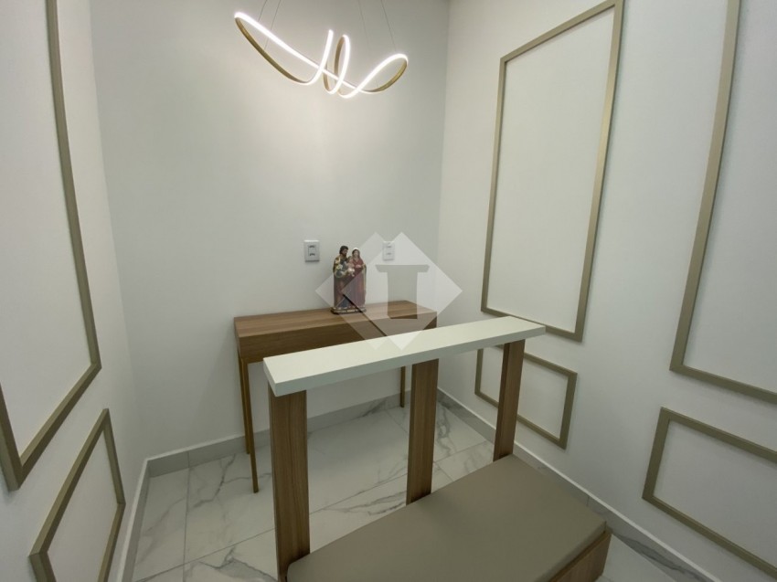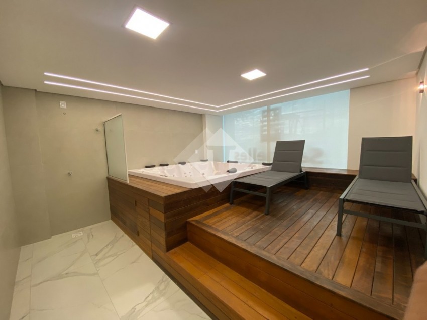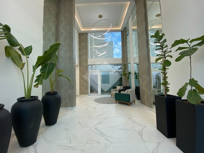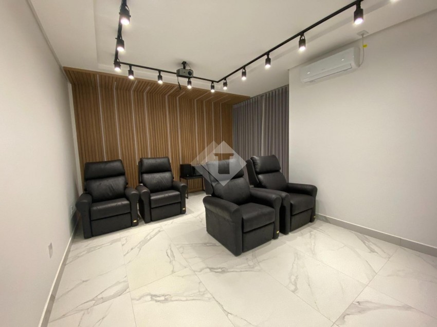 Áreas de lazer e convivência completas, incluindo salão de festas com espaço gourmet, sala de cinema e sala de jogos, brinquedoteca, academia, spa, sauna, capela e hall de entrada com pé direito duplo.
