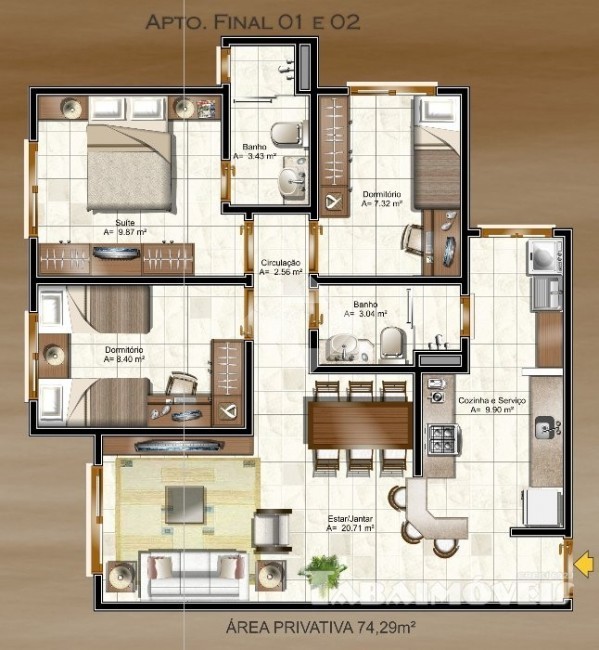 Ótimo apartamento com excelente posição solar com 01 suíte + 02 dormitórios, sala, cozinha, banheiro, área de serviço e 01 box de garagem.