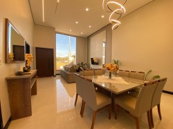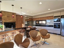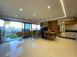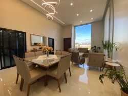 No interior, o amplo living se destaca por um imponente pé-direito elevado, complementado por acabamentos de altíssimo padrão que conferem elegância e durabilidade a cada canto. A praticidade se une ao luxo com as persianas automatizadas, oferecendo controle total da luz e da privacidade ao toque de um botão.