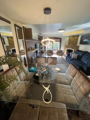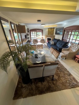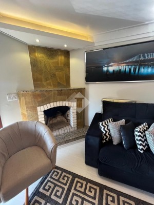Uma linda sala de estar e jantar com uma bela lareira para os dias mais frios.