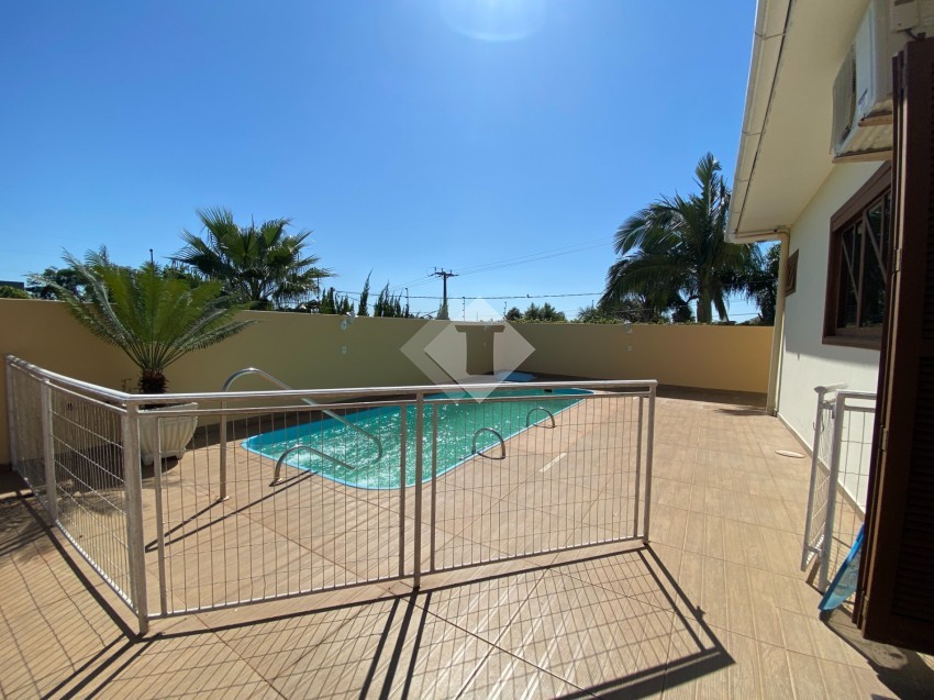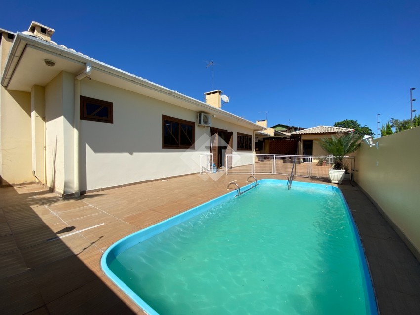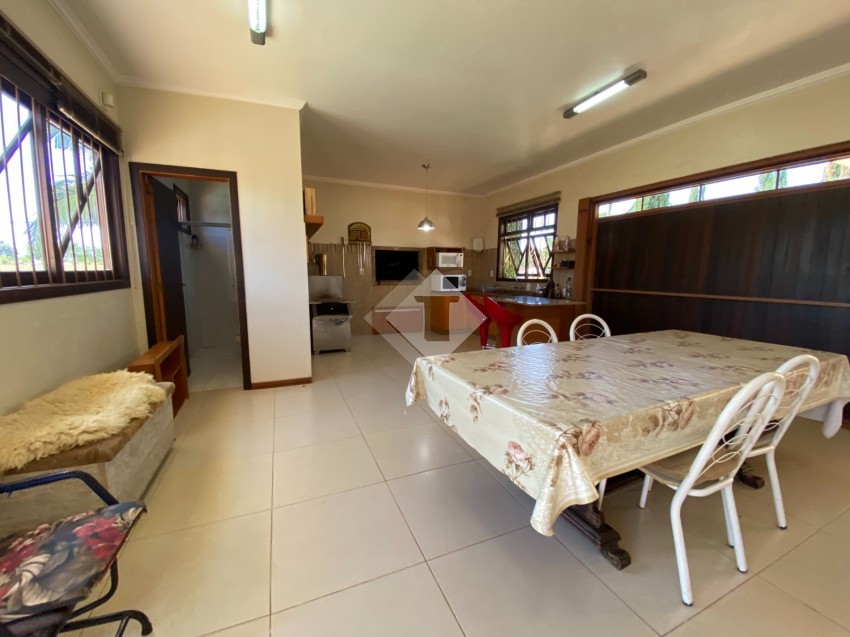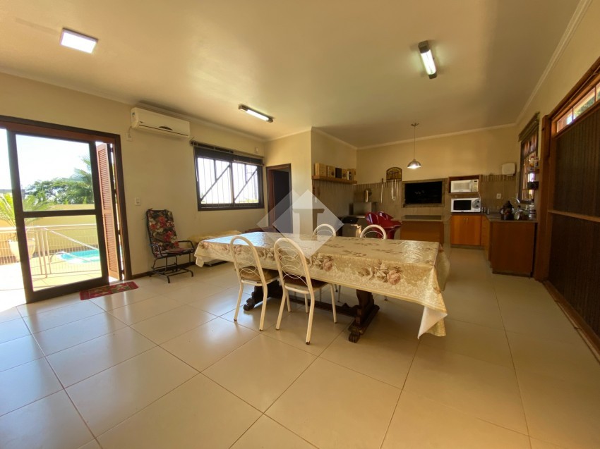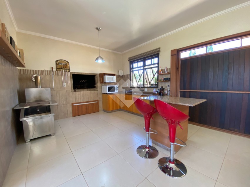 A residência oferece uma ampla sala, cozinha americana totalmente mobiliada e uma área de lazer completa com churrasqueira e piscina.