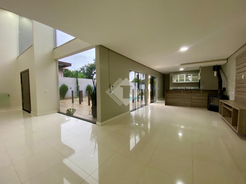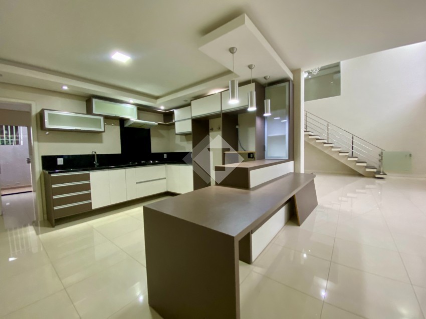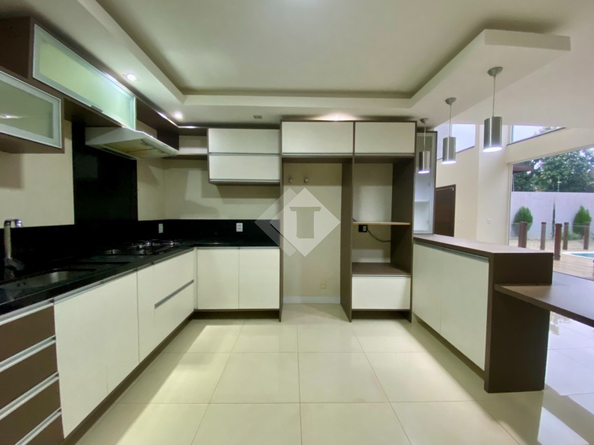 No primeiro piso possui 3 salas em conceito aberto e uma cozinha americana sobmedida, uma área de serviço e mais 02 espaços que podem ser quartos de visita ou despensa;