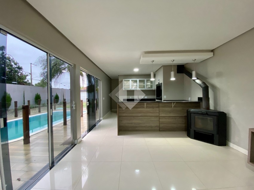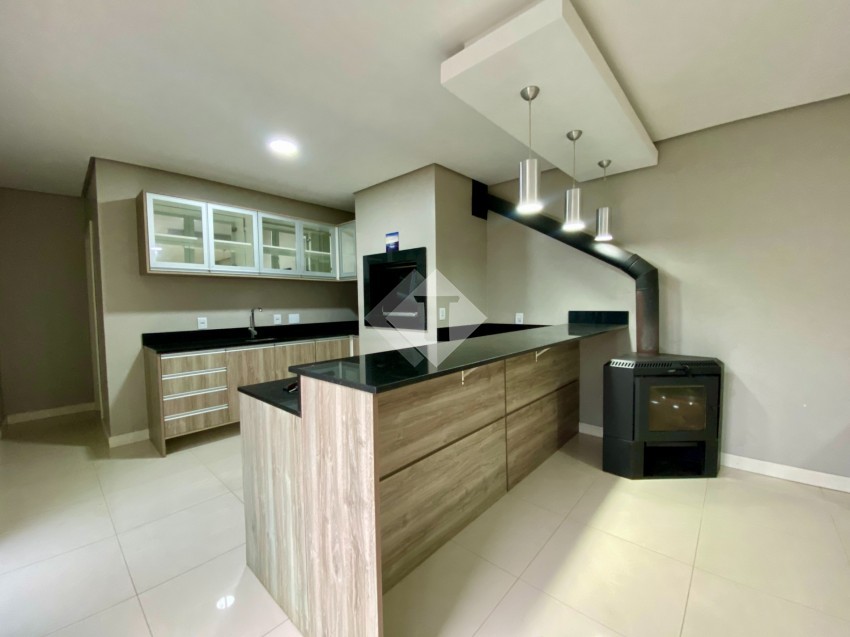 Uma área gourmet com cozinha sobmedida e churrasqueira, uma lareira, um calefator.