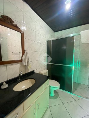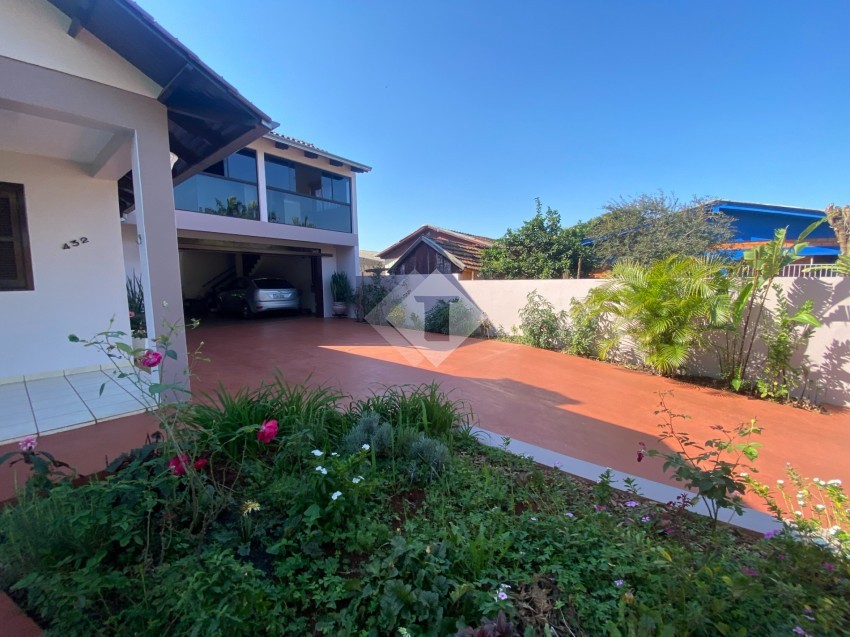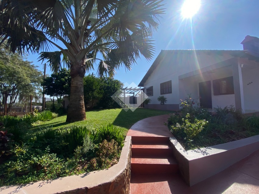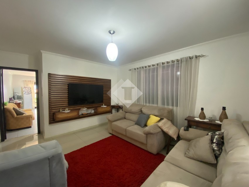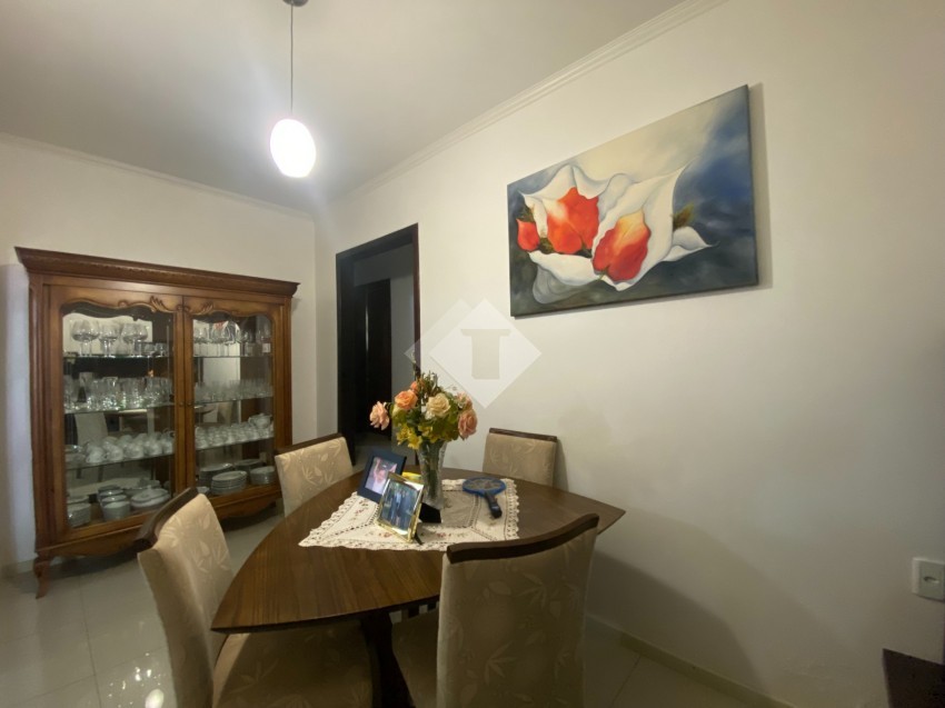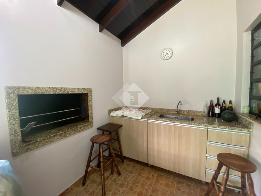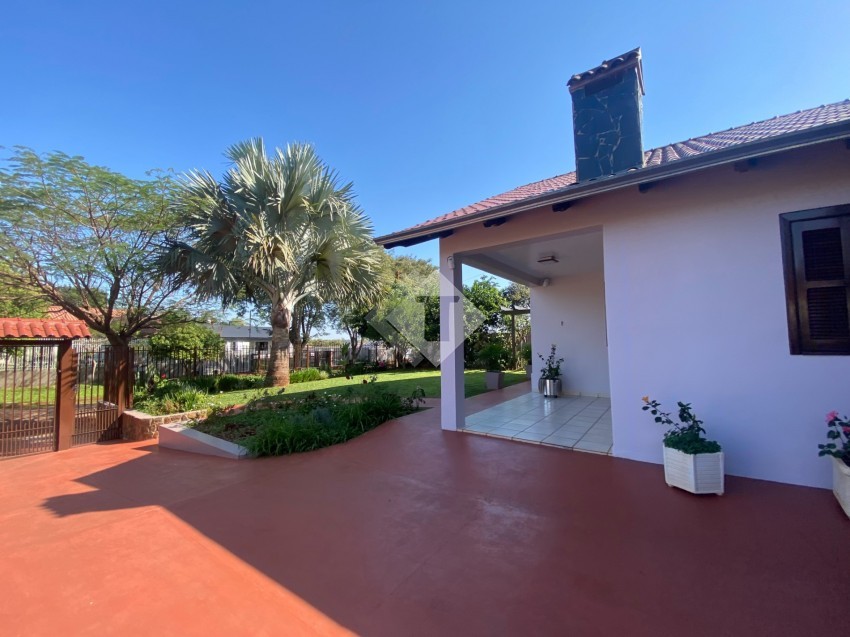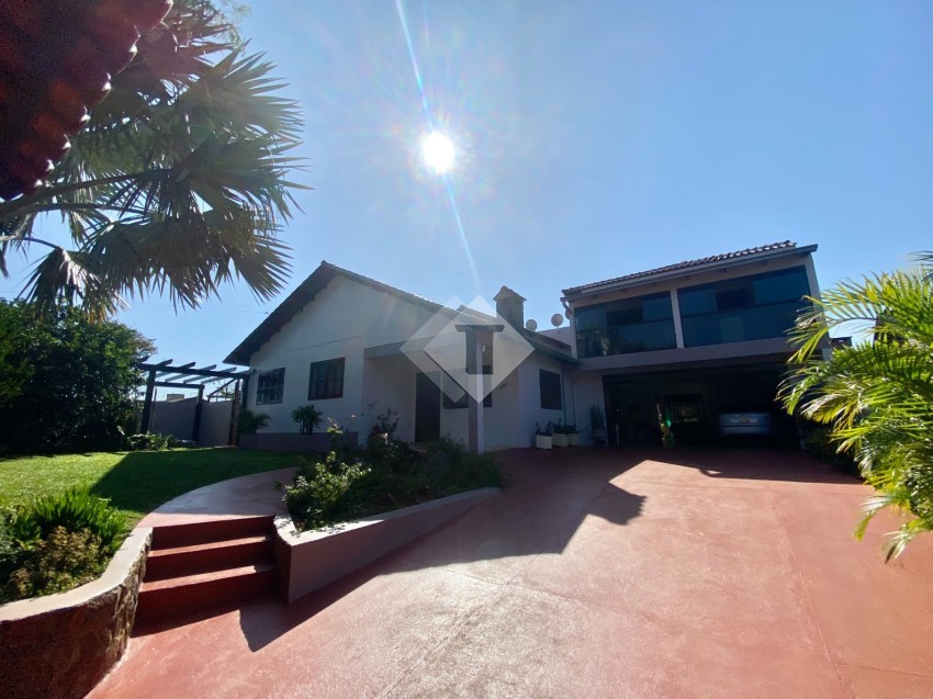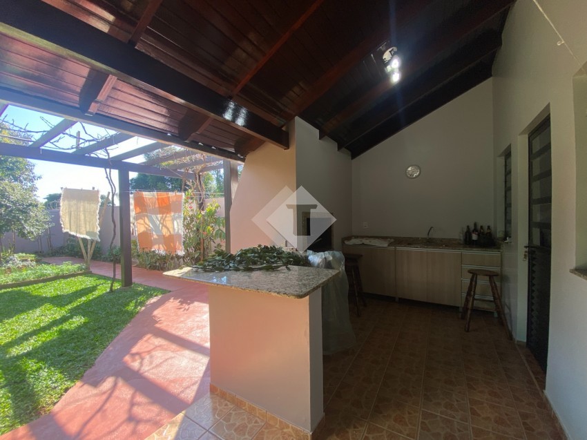 Esta residência possui uma suíte com closet e banheira, mais 03 dormitórios. Duas salas, cozinha ampla, garagem para 02 carros e um salão de festas com lareira na parte superior, com mais um cômodo e um banheiro. A casa também possui um jardim com árvores frutíferas e uma área de festas com churrasqueira e cozinha.