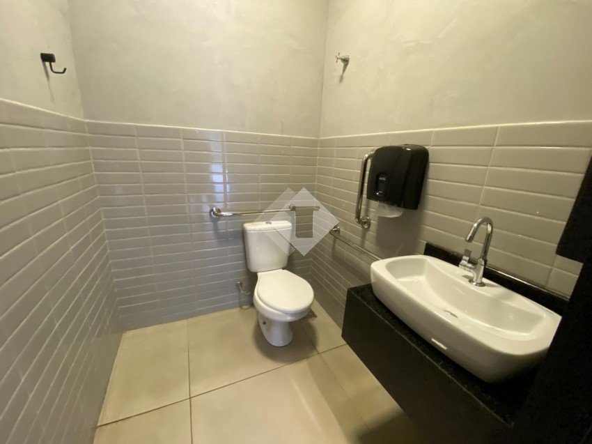 Espaço comercial ao lado do banco Santander, com lavabo, recepção, amplo espaço, e andar superior.