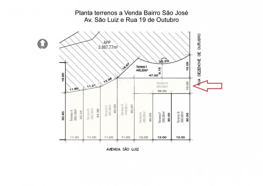Lindo lote plano de 10,00m x 36,00m (360,00m2) de meio de quadra. Documentação 100%. Pronto para edificação.