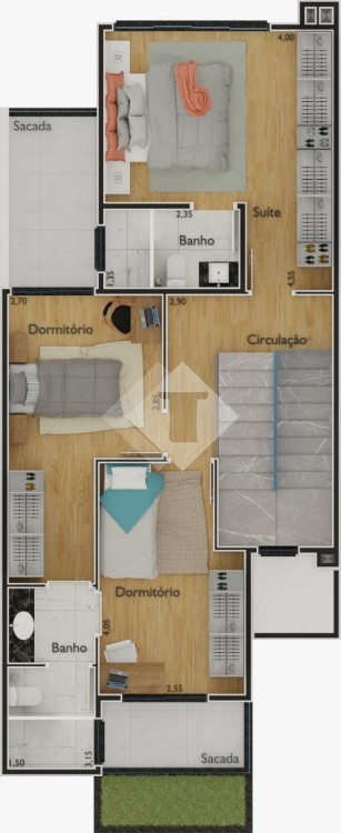 Com uma suíte e mais duas demi-suítes com sacada, no piso superior;